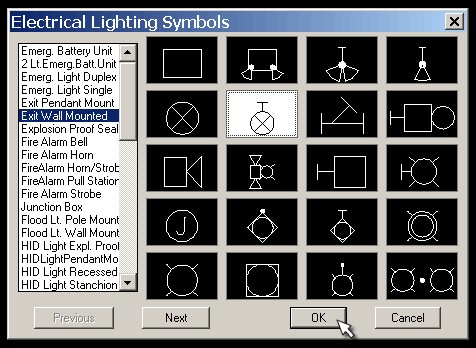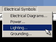 Simply choose an electrical category of symbols from the pull-down menu list. Next, a dialog box appears showing all of the available symbols with a description in the left window. Choose the symbol you would like to insert and click on “OK”. Lastly, rotate to the desired position in your AutoCAD drawing and insert the symbol.